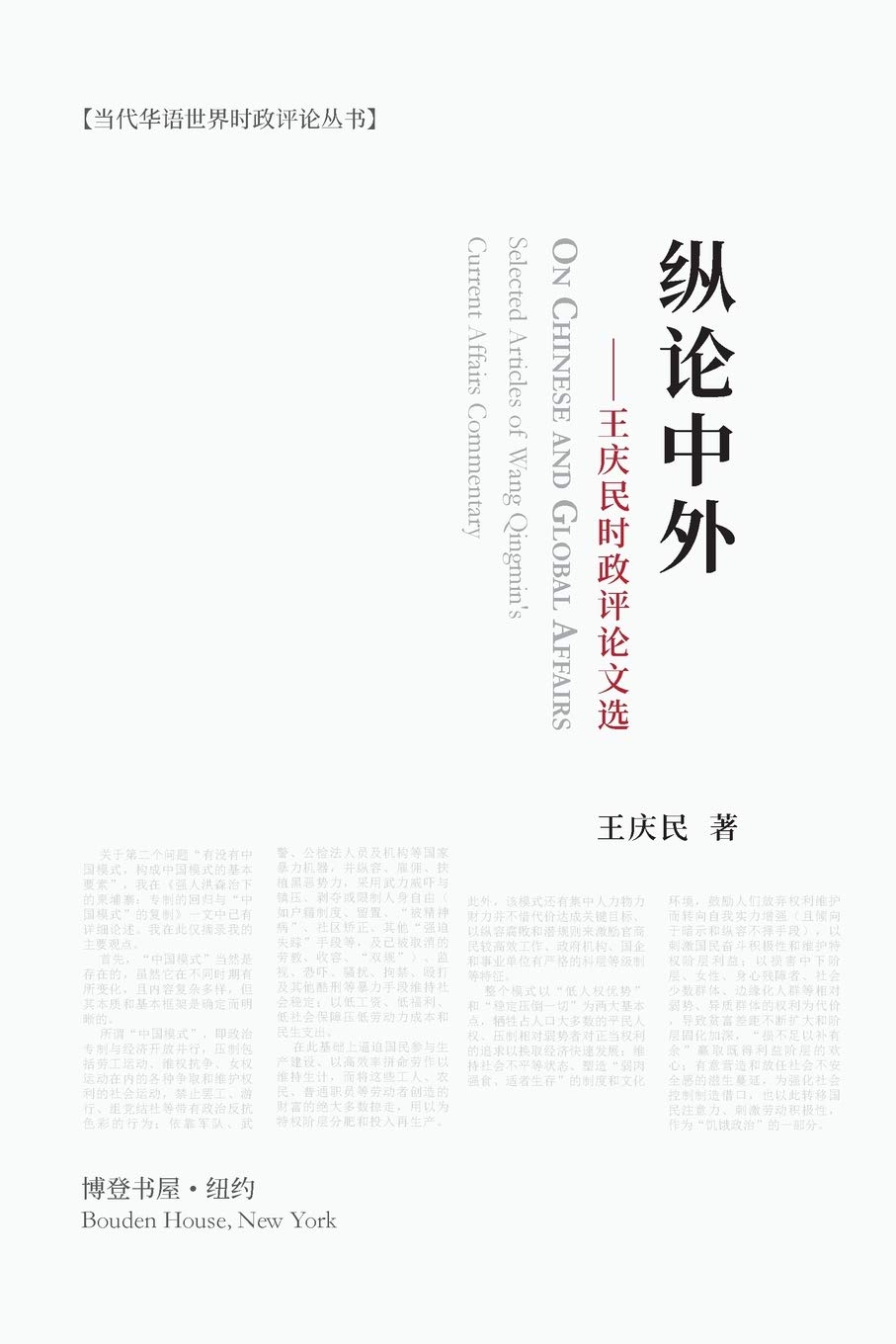 本书是作者在2018-2020年间所写的政论和时评结集。全书共有8篇长文,涵盖中外政治、经济、社会、民族、民生等议题。既有对当今中国现实的批判,也有对中国历史问题的回顾,还有对国外民主政治与社会转型的介绍。 中国部分,作者发表对中国民族主义问题和中国各领域现状的看法,提出对中国民主转型的若干建议;作者还详细讨论了满清统治对汉族、中华历史的影响;通过解析各民权民生数据所反映的事实,勾勒一幅中国特色极权社会的数字画像。 国际部分,作者讨论了"中国模式"的性质及向海外的输出;讨论了民主政治的复杂性、民族与宗教问题在政治中的敏感性;论证了地缘政治、外国势力对一国内政的深刻影响;讲述了民主转型的漫长、曲折与艰巨。